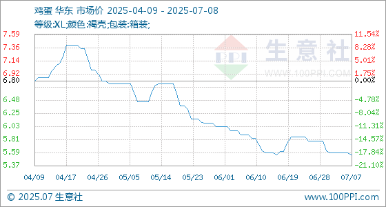 7月8日,生意社鸡蛋基准价为5.55元/公斤,与本月初(5.62元/公斤)相比,下降了1.25%。