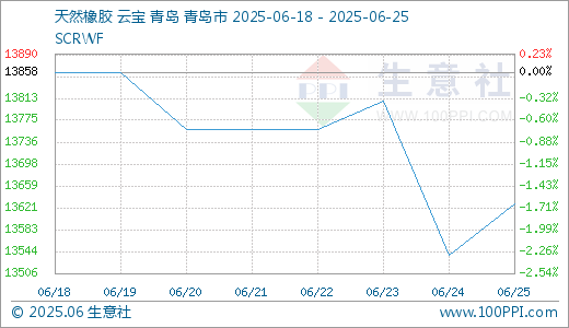 据生意社商品行情分析系统,近期(6.18~6.25)国内天然橡胶现货市场行情震荡下行,截止6月25日我国天然橡胶市场现货胶行情在13628元/吨左右,较18日的的13858元/吨整体下跌了1.66%。
