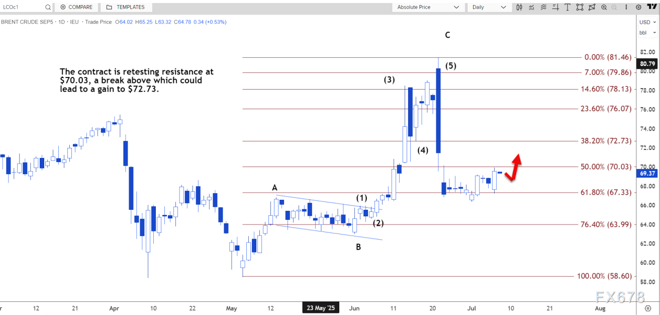 日线图显示,该合约正在重新测试70.03美元的阻力位,突破该阻力位可能上涨至72.73美元。确认突破的指标之一是市场收盘价高于该水平。
