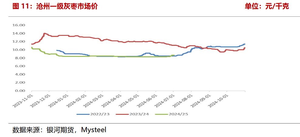 目前沧州一级灰枣(18-20mm,21%≤含水率≤23%)市场价为8.7元/千克,折8700元/吨。现在12月、1月、3月合约价格都在一万元以上,而且去年年底交易所公布新规,旧季作物可以用于新季交割,因此许多人考虑接9月合约卖于新季合约。我们认为虽然逻辑可行,但是实际操作仍有许多不确定性。