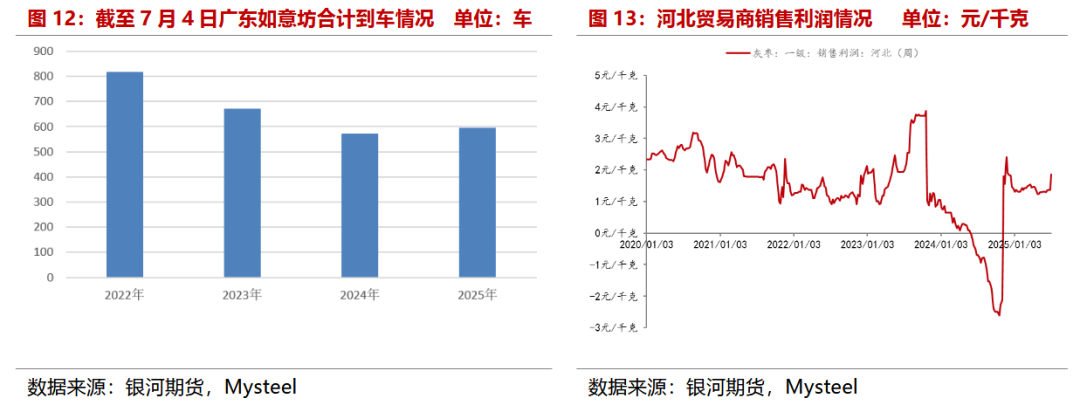 红枣是居民日常生活中的非需求消费品,因此其需求弹性相对较大,经济形势较好的时候需求大,经济形势不好的时候需求大概率会下降,因此国内的经济情况对红枣的终端需求有一定的影响。2024年由于国内消费情况不好,红枣的消费明显不佳。2025年预计国内经济仍有较大的压力因此预计红枣的需求情况仍不乐观。根据Mysteel数据显示,2025年截至7月4日广东如意坊红枣到货共596车,同比增加4%,但是到货车量明显不及2023年(同期累计到货量673车)和2022年(同期累计到货量819车)。