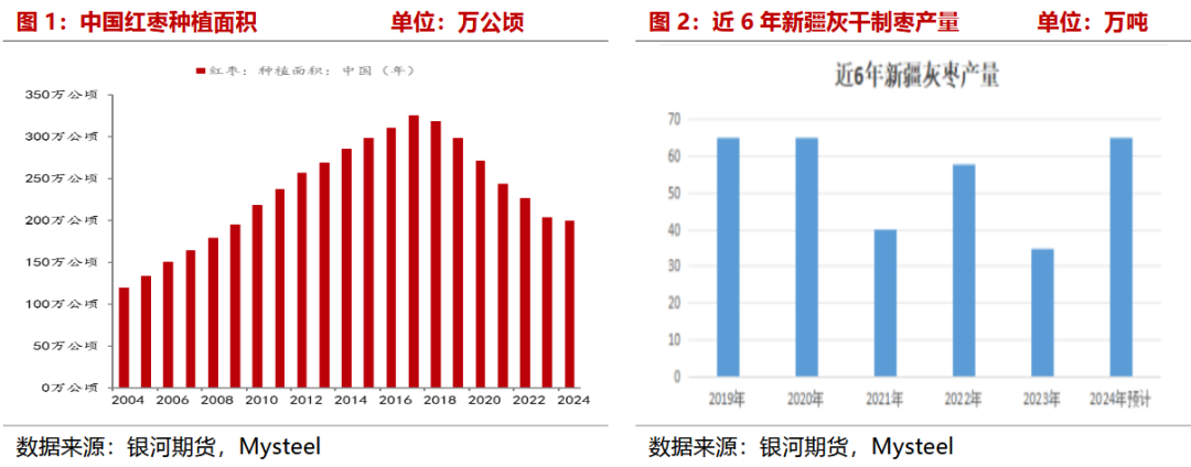主产区新疆地区最近几年红枣种植面积较稳定,产量的变化主要是由单产的变化引起的。2020年新疆干制灰枣产量在约65-70万吨左右,而2021年单产大幅下降产量约40万吨,2022年灰枣产量恢复性增长约55-60万吨,2023年产量约35万吨,2024年产量预计约65万吨。