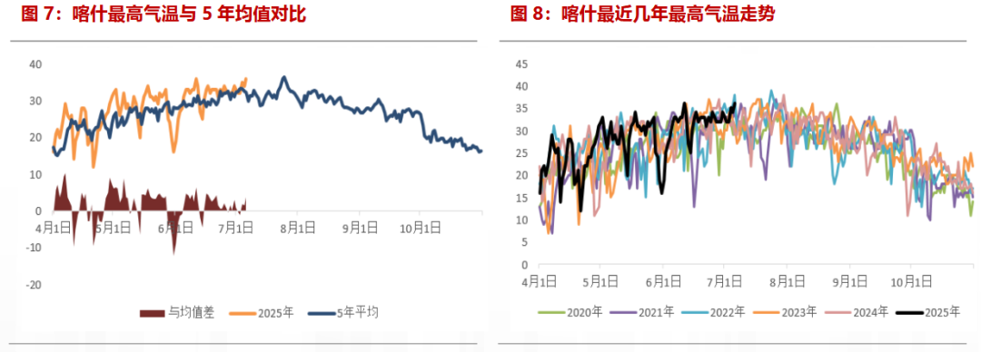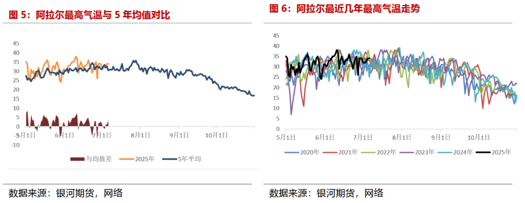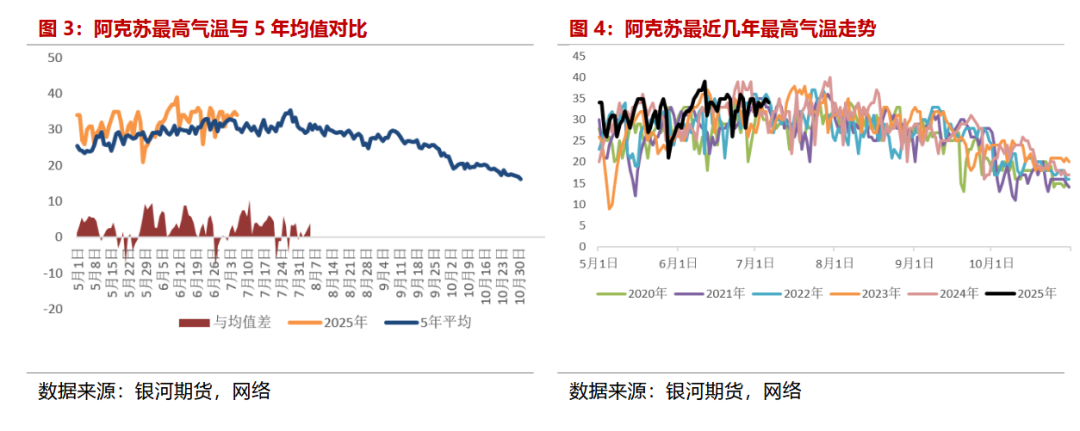 今年红枣主产区南疆天气情况一般,红枣一茬花遭遇沙尘暴,坐果情况不好。二茬花是否面临气温高坐果不佳的情况目前尚不能下定论,需等到7月中旬后才能大体确认,因此未来一周多的时间将是确定红枣产量的关键时期。从目前的情况来看,今年阿克苏、阿拉尔以及喀什地区最高气温确实比往年同期要高一些,可能会对红枣坐果产生一些影响。