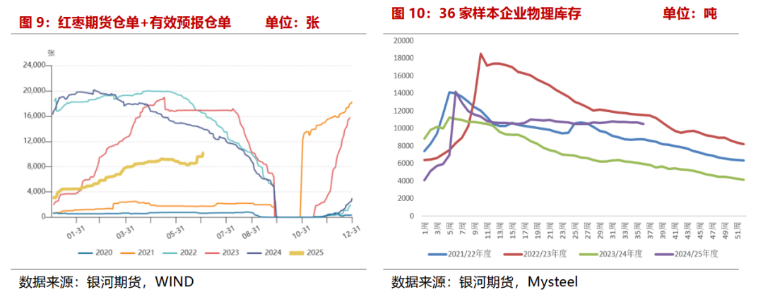 2025年红枣新季产量大概率减产,但是2024年是近些年的大丰产年份,如果新季作物仅仅出现小幅度减产那么在库存高企的现状下预计价格向上空间有限。如果新季红枣不仅一茬花坐果有问题,二茬花坐果也出现比较大的问题的话确实可能会引起一波上涨,但是由于旧季可以用于新季交割,只要价差能够覆盖旧季节交割新季仓单成本那么大量旧季库存也限制了红枣的上涨空间。所以未来一段时间二茬花的坐果情况将是市场的一个关注点,且如果新季减产预期大那么对于新季统货收购价格也将形成一定的支撑。