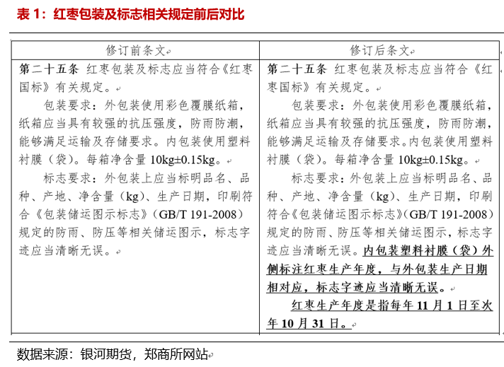 2024年12月12日发布了《关于发布红枣期货业务细则修订案的公告》,公告的第二十六条非本生产年度生产的红枣不得在本生产年度(红枣生产年度是指每年11月1日至次年10月31日)注册标准仓单。上一生产年度生产的红枣可以以车(船)板方式在本生产年度12月、1月、3月合约贴水交割,贴水标准由交易所确定并公布。本次修订适用于红枣期货2512及后续合约,自红枣期货2512合约挂牌之日。