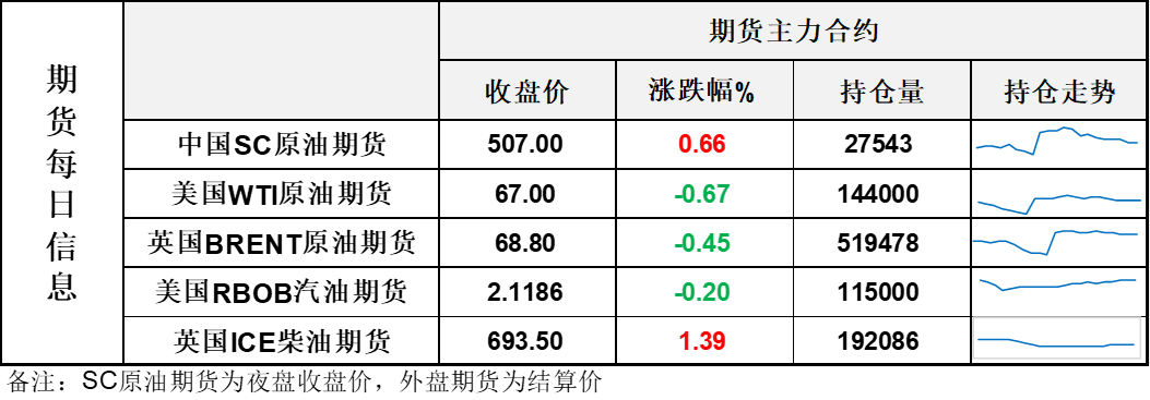 【1】WTI主力原油期货收跌0.45美元,跌幅0.67%,报67美元/桶;布伦特主力原油期货收跌0.31美元,跌幅0.45%,报68.8美元/桶;INE原油期货收涨0.66%,报507元。