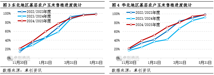 由于去年新季玉米上市后东北出现暖冬天气,以及市场价格持续偏弱,产区基层农户售粮积极性提升,售粮进度明显快于去年同期。叠加减产影响,导致今年上半年产区玉米供应趋紧。期间受到中美关税问题的影响,以及贸易商库存低于去年同期水平,市场看涨情绪浓厚,产区供应紧张状态持续。卓创资讯监测数据显示,一季度东北基层农户平均售粮进度由59%提升到89%,平均售粮进度为75%,较去年同期快11个百分点;华北基层平均售粮进度为67.67%,较去年同期偏快19个百分点。二季度基层粮源陆续收尾并转移到贸易商环节,但由于近年贸易商持续亏损,今年库存量多低于去年同期水平,且部分库存分散在中小型贸易商手中。据卓创资讯调研了解,截至6月末,东北产区多地贸易商库存量较去年同期下降40%-50%。