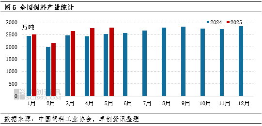 饲料市场作为玉米重要的下游消费领域,饲料产量变化对玉米市场有着至关重要的影响。中国饲料工业协会数据显示,今年上半年全国饲料产量整体是增长趋势,1-5月饲料总产量12814万吨,较去年同期增长8.30%。除春节所在的2月份,其他月份同环比多表现为不同程度增加。由于玉米价格上涨,饲料企业原料成本存在一定压力,配合饲料中玉米用量呈下降趋势。新季小麦集中上市后,价格替代优势明显,华中、南方饲料企业积极采购小麦,玉米仅维持刚需采购。除此之外,由于畜禽产能处于近年同期较高位,主要养殖区域的养殖粮需求对市场有一定支撑。再者,玉米进口量同比锐减,饲料市场需求对玉米亦有较强支撑。