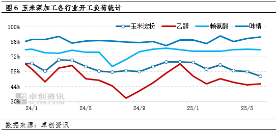 相较于饲料市场来看,玉米深加工需求表现偏弱。由于今年上半年玉米价格持续上涨,深加工产品价格上涨乏力,深加工企业生产压力居高不下,部分行业持续处于亏损状态,开工负荷下降。卓创资讯监测数据显示,今年上半年玉米淀粉、乙醇、赖氨酸、味精的开工负荷分别为60.40%、48.70%、78.06%、88.39%,较去年下半年分别下降1.57个百分点、上升0.75个百分点、提升3.50个百分点、提升2.52个百分点,较去年上半年分别下降3.61个百分点、下降7.28个百分点、上升1.10个百分点、上升0.64个百分点。从玉米需求来看,玉米淀粉、乙醇行业需求下降较多,赖氨酸得益于畜禽产能增加开工负荷上升,味精行业开工负荷上升主要受春节需求旺季带动。但赖氨酸、味精行业玉米需求占比较低,其增量难以弥补玉米淀粉、乙醇行业的需求缺口,所以今年上半年深加工企业的玉米需求减少