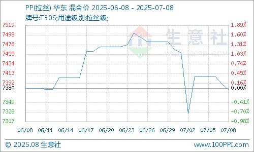 据生意社商品行情分析系统显示,7月初国内PP市场行情跌后震荡,部分牌号产品价格下调。截止7月8日,国内生产商、贸易商拉丝主流报盘价格在7376.67元/吨左右,较7月初价格水平涨跌幅-1.09%。