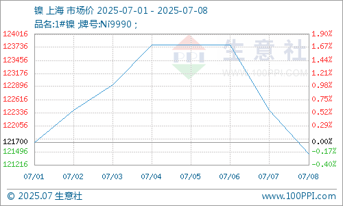 据生意社商品行情分析系统监测,7月8日,现货电解镍报121450元/吨,周跌幅0.21%,同比下跌11.98%,延续弱势震荡。