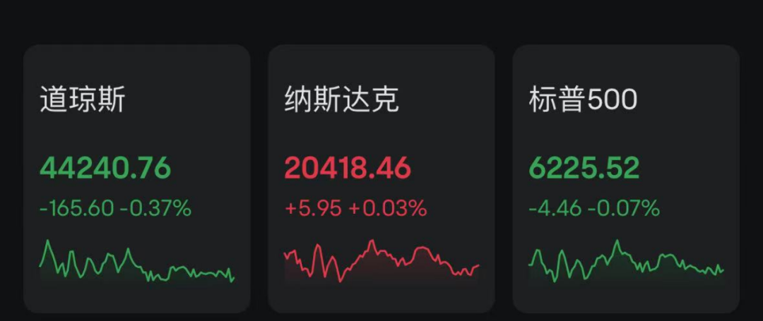 当地时间周二,美国三大股指涨跌不一。截至收盘,道指跌0.37%报44240.76点,标普500指数跌0.07%报6225.52点,纳指涨0.03%报20418.46点。其中,道指、标普500指数均录得两连跌。