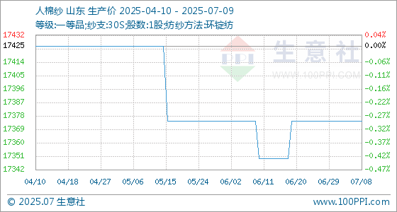 7月9日,生意社人棉纱基准价为17375.00元/吨,与本月初持平。