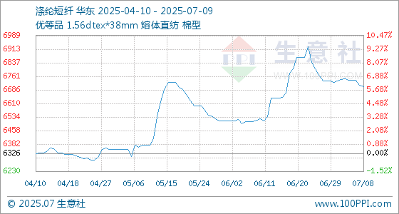 7月9日,生意社涤纶短纤基准价为6704.58元/吨,与本月初(6727.92元/吨)相比,下降了0.35%。