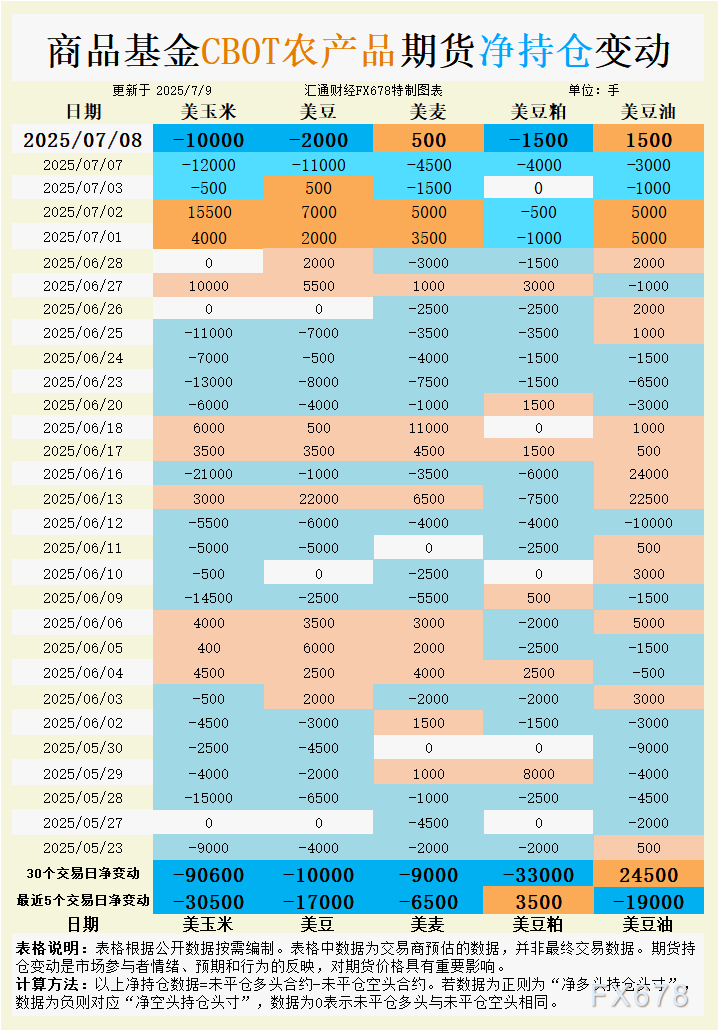 汇通财经APP讯——周三(7月9日),芝加哥期货交易所(CBOT)谷物期货市场延续震荡偏弱走势,玉米、大豆和豆粕期货价格进一步下探,触及年内低位,小麦和豆油则表现相对分化。受美国中西部有利天气和USDA作物报告利空影响,市场对丰收预期增强,叠加关税言论引发的出口需求担忧,资金情绪偏向谨慎。CBOT12月玉米期货(CZ25)收跌6.5美分,报4.14-1/4美元/蒲式耳;11月大豆期货(SX25)下跌3.25美分,报10.17-1/2美元/蒲式耳;堪萨斯城9月硬红冬小麦期货(KWU25)下跌5美分,报5.22-1/2美元/蒲式耳;8月豆粕期货(SMQ25)下跌1.5美元,报270.7美元/短吨;豆油则因生物燃料需求支撑,持仓显示资金净多头增加。本文基于最新持仓变动、基差动态及国际交易数据,分析小麦、大豆、豆油、豆粕和玉米的盘面情绪及未来走势。