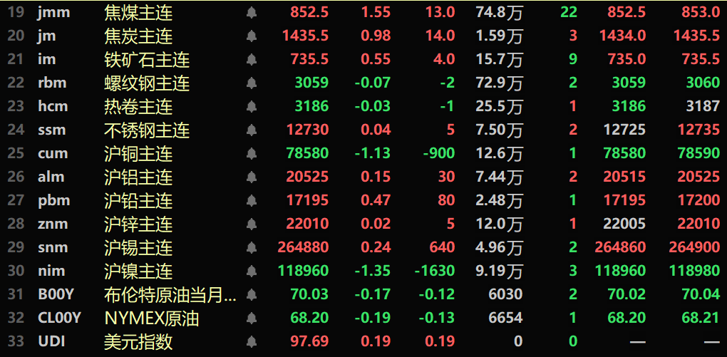 黑色系多飘红,铁矿涨0.55%,螺纹、热卷微跌。不锈钢涨0.04%。双焦方面:焦煤涨1.55%,焦炭涨0.98%。