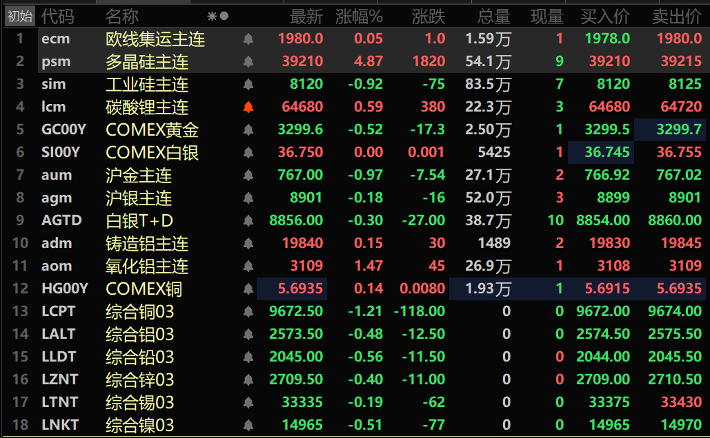 此外,铸造铝主连期货涨0.15%,氧化铝主连涨1.47%。碳酸锂涨0.59%,工业硅跌0.92%。值得一提的是,8日出现涨停的多晶硅主连,延续了前5个交易日的涨势继续涨4.87%。