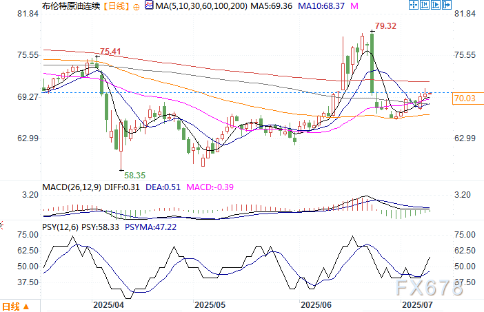 北京时间7月9日15:16 布伦特原油连续 报 70.09 美元/桶