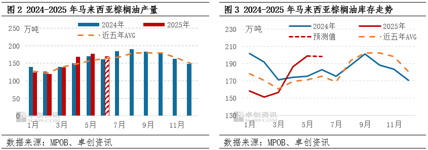 根据棕榈油产量的季节性特征,预计下半年主产区产量将在9-10月达到峰值后转入下行周期,供应端呈现逐步收紧态势。同时需求端有望获得多重提振,作为全球最大棕榈油进口国,印度上半年进口量及国内库存持续处于低位,但据印度进口商数据显示,6月进口量已回升至95万吨,创近11个月新高。考虑到下半年印度将迎来传统节日备货旺季,消费需求的持续回暖有望提振产地出口。在供需两端共同作用下,三季度马来西亚棕榈油库存累积速度或将明显放缓,四季度或转入去库存周期,市场格局由松转紧,为棕榈油价格提供持续上行支撑。