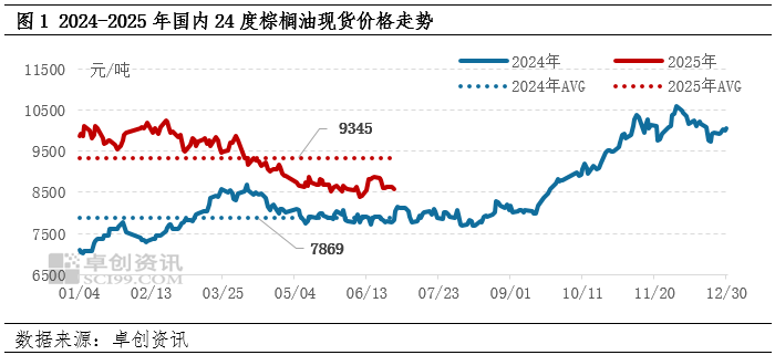 2025年上半年国内24度棕榈油现货价格整体先高位震荡后下跌,价格重心较2024年有所上移。截至二季度末,国内24度棕榈油主要市场(张家港、天津、广州、日照)现货均价为9345元/吨,比2024年同期上涨18.76%。上半年价格高点出现在2月20日10236元/吨,最低点在6月11日8395元/吨。