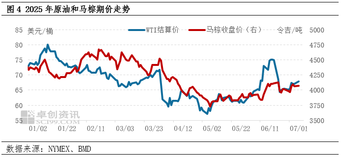 关税实质影响有限。7月初特朗普对多个国家发出关税税率威胁,对棕榈油的潜在出口构成压制。不过美国棕榈油需求量占全球总需求比例不及3%,且基本属于刚需,短期直接影响有限。但下半年特朗普关税政策的不确定性可能增加市场对全球经济及原油需求走弱的担忧,进而对油脂板块形成间接拖累。