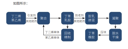 丁苯橡胶的生产工艺流程主要包括聚合、未反应单体的回收、胶乳掺混、凝聚、脱水与干燥、压块包装等六个主要工序。