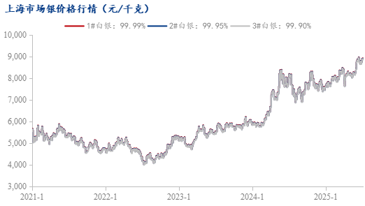 2025年7月9日,Mysteel上海地区1#白银现货均价报8875元/千克,跌10元/千克;沪银主力合约跌0.20%,报8899元/千克;COMEX银跌0.73%,报36.79美元/盎司;伦敦银现货跌0.60%,报36.60美元/盎司;美国10年期国债收益率报4.386%,美元指数报97.56。