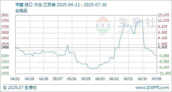 7月10日,生意社甲醇基准价为2390.33元/吨,与本月初(2805.00元/吨)相比,下降了14.78%。