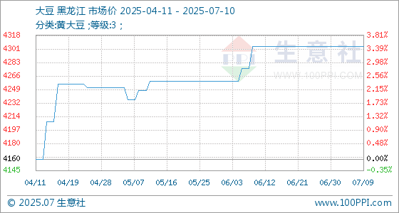 7月10日,生意社大豆基准价为4304.00元/吨,与本月初持平。