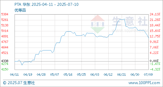 7月10日,生意社PTA基准价为4852.50元/吨,与本月初(5104.75元/吨)相比,下降了4.94%。