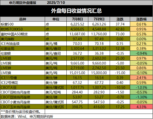 国家统计局发布数据,中国6月CPI同比上涨0.1%,为连续下降4个月后转涨;核心CPI继续回升,同比上涨0.7%,创14个月新高。6月PPI环比下降0.4%,降幅与上月相同,同比下降3.6%,降幅比上月扩大0.3个百分点。美联储公布的最新6月会议纪要显示,官员们对利率前景的分歧日益显现,主要源于他们对关税可能如何影响通胀的预期不同。与会者普遍认为,由于经济增长和劳动力市场仍然稳健,而当前的货币政策或有适度的限制性,委员会完全有能力等待通胀和经济活动前景更加明朗。2025年7月9日,国内商品期市夜盘收盘多数上涨,化工品普遍上涨,其中20号胶上涨2.91%;黑色系普遍上涨,其中焦煤上涨2.03%,焦炭上涨1.59%,农副产品普遍上涨,其中纸浆上涨1.33%;油脂油料涨跌互现,豆粕上涨0.24%,豆油持平,豆一下跌0.10%,棕榈油下跌0.44%。