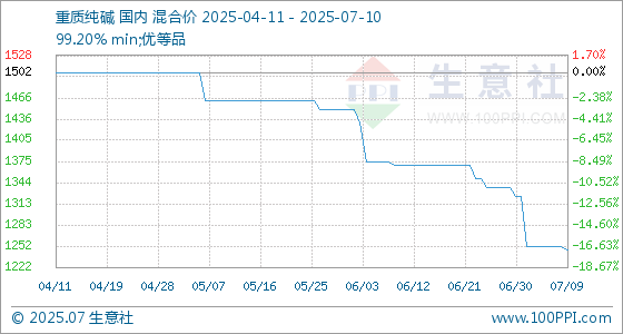 7月10日,生意社重质纯碱基准价为1247.50元/吨,与本月初(1325.00元/吨)相比,下降了5.85%。