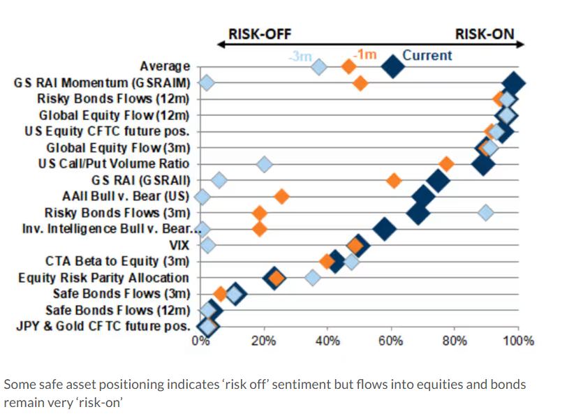 一些避险资产的持仓显示“风险厌恶”(即risk-off),但流向股票和债券资产的资金仍然非常“偏好风险”(即risk-on,也被称作追逐风险)。虽然标普500指数已经创下历史新高,但是在“金发姑娘”式的乐观宏观环境下,美股市场的risk-on(追逐风险)动能可谓只增不减。