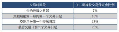 上期所根据丁二烯橡胶期货合约上市运行(即从该期货合约新上市挂牌之日起至最后交易日止)的不同阶段制定不同的交易保证金收取标准。