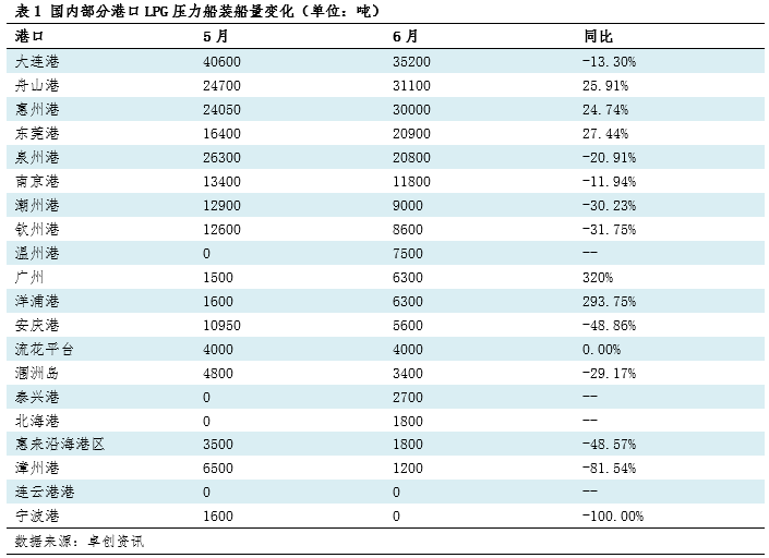 分港口来看,国内炼厂集中检修结束,炼厂供应量增加,另外部分炼厂自用略有减少,导致装船量明显增加,从表1可见,舟山、惠州、洋浦等港口装船量出现明显上升,但需要注意的是钦州港装船量明显下降,因大连港大量装船发往广州,一定程度挤压广西装船量。南京、安庆、泉州等以饱和气以及醚后碳四为主要装船资源的港口装船量也有不同程度下降,因市场需求不佳。