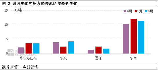 通过接船地来看,华东当地接船量明显增加,因浙江炼厂装船大量在江苏浙江等地消耗,而华南以及山东同比虽有下降,但整体依旧保持在合理区间,尤其华北及山东较4月份增加明显,因当地醚后碳四价格回升,其它区域醚后碳四资源流入恢复正常。沿江当地则出现明显下降,因湖北乙烯装置对液化气使用下降,江苏、安徽等地炼厂装船饱和气资源明显下降。