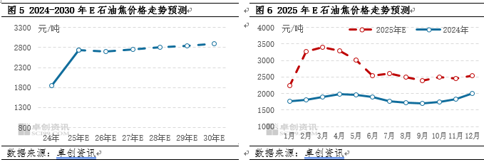综上所述,卓创资讯《2025中国石油焦市场半年度深度报告》中关于下半年的趋势预测略有调整,2025年上半年供需均出现阶段性增加,在经历了2025年上半年大起大落后,2025年下半年石油焦市场或将表现为供增需淡局面,石油焦供需矛盾已经突出,并且基于港口库存带来的压力,在此背景下,下半年石油焦依旧艰难前行。供应方面,考虑到国产供应量处于平稳阶段,进口量在上半年冲高后,下半年大概率呈现减少趋势,虽然港口高成本现货库存处于高位,但后期将有低成本货源逐步补充到国内。需求方面,国内宏观经济表现不及预期,下半年需求量将保持平稳,考虑到港口库存压力,下半年石油焦市场仍呈现弱势震荡局面,伴有阶段性涨跌。根据季节性规律判断,下半年的高点大概率出现在7月份,低点或出现在第四季度的取暖季阶段。卓创资讯预计,下半年国内石油焦均价区间或在2400-2600元/吨。