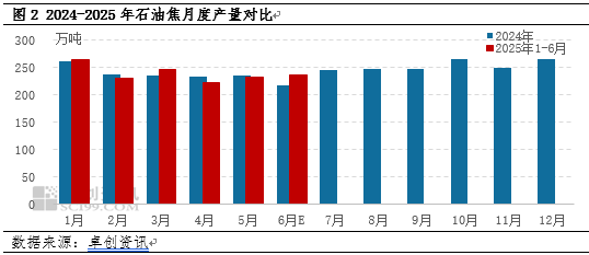 当前国内石油焦产能仍处于平稳周期,暂未有炼厂新投产石油焦产能,产量方面,今年国内炼厂延迟焦化装置检修数量较2024年增多,焦化装置平均开工负荷由2024年下半年的63.08%下降至今年的58.63%,作为副产品,石油焦产量受成品油市场影响较大,2025年上半年成品油市场需求同比表现欠佳,山东地炼利润亏损较为严重,打击了生产积极性,焦化装置平均开工负荷同比下滑明显,受此影响国内石油焦产量减少,2025年1-5月份,国内石油焦产量为1196.67万吨,环比减少0.54%,国内石油焦资源整体依旧较为紧缺。预计2025年1-6月份,国内石油焦产量为1432.97万吨,同比增加1%。