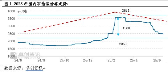 上半年国内石油焦市场呈现先扬后抑局面,其走势与我们在《2024-2025中国石油焦市场年度报告》中预测的基本一致,《2024-2025中国石油焦市场年度报告》我们认为,2025年石油焦市场或呈现震荡谨慎向好局面,但随着价格涨势过大,无论是贸易商还是下游终端方面将会考虑风险问题,预估稳步运作为主。从上半年实际波动看,呈现供需博弈下的跌涨转换,春节后市场价格快速拉涨,二季度震荡回落,市场进入下行通道,并在6月维持低位震荡格局。
