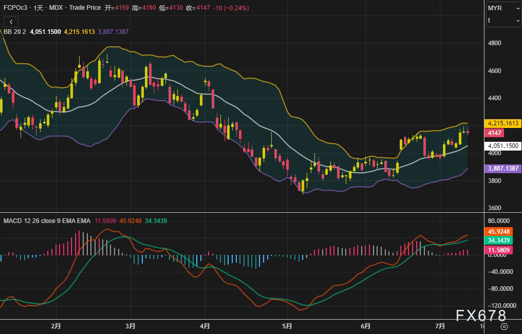 汇通财经APP讯——周四(7月10日),马来西亚衍生品交易所(BMD)棕榈油主力合约FCPOc3收报4147林吉特/吨,日内下跌0.24%,结束此前三连涨。日线级别MACD指标呈现11.58的柱状线,快慢线间距收窄至34.34,布林通道中轨位于4051林吉特,显示市场正面临方向性选择。