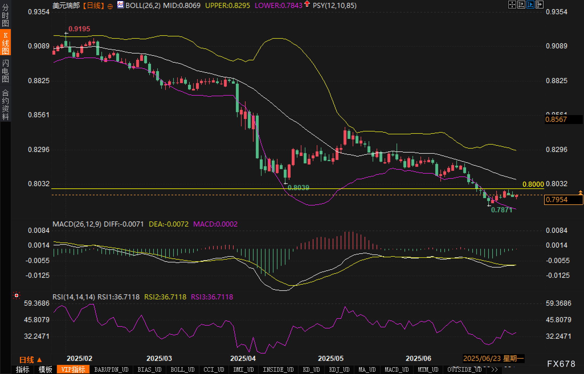 短期内,分析认为若美元兑瑞郎未能有效站上0.8000心理关口,多头反击空间有限。技术面上缺乏明确反转信号,市场将更多维持“逢高沽空”心态。0.7870一线为关键支撑,若被跌破,则汇价或进一步向0.7840区域回落。