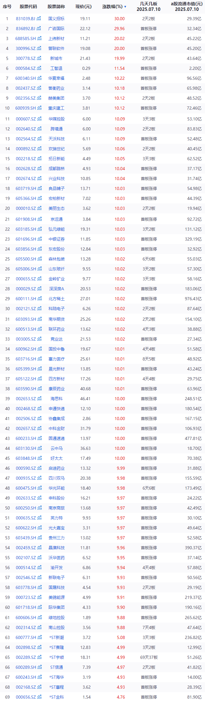 高涨幅热门股:同宇新材涨幅达128.05%,广咨国际涨幅29.96%,上纬新材、普联软件等涨幅均超20%,在当日涨幅榜中位居前列。