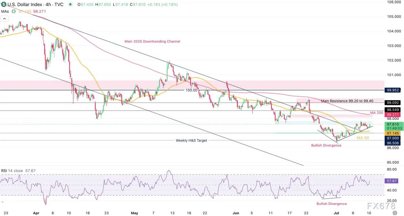 在与上一轮低点形成看涨背离后,美元目前正突破2025年的主要下行通道。