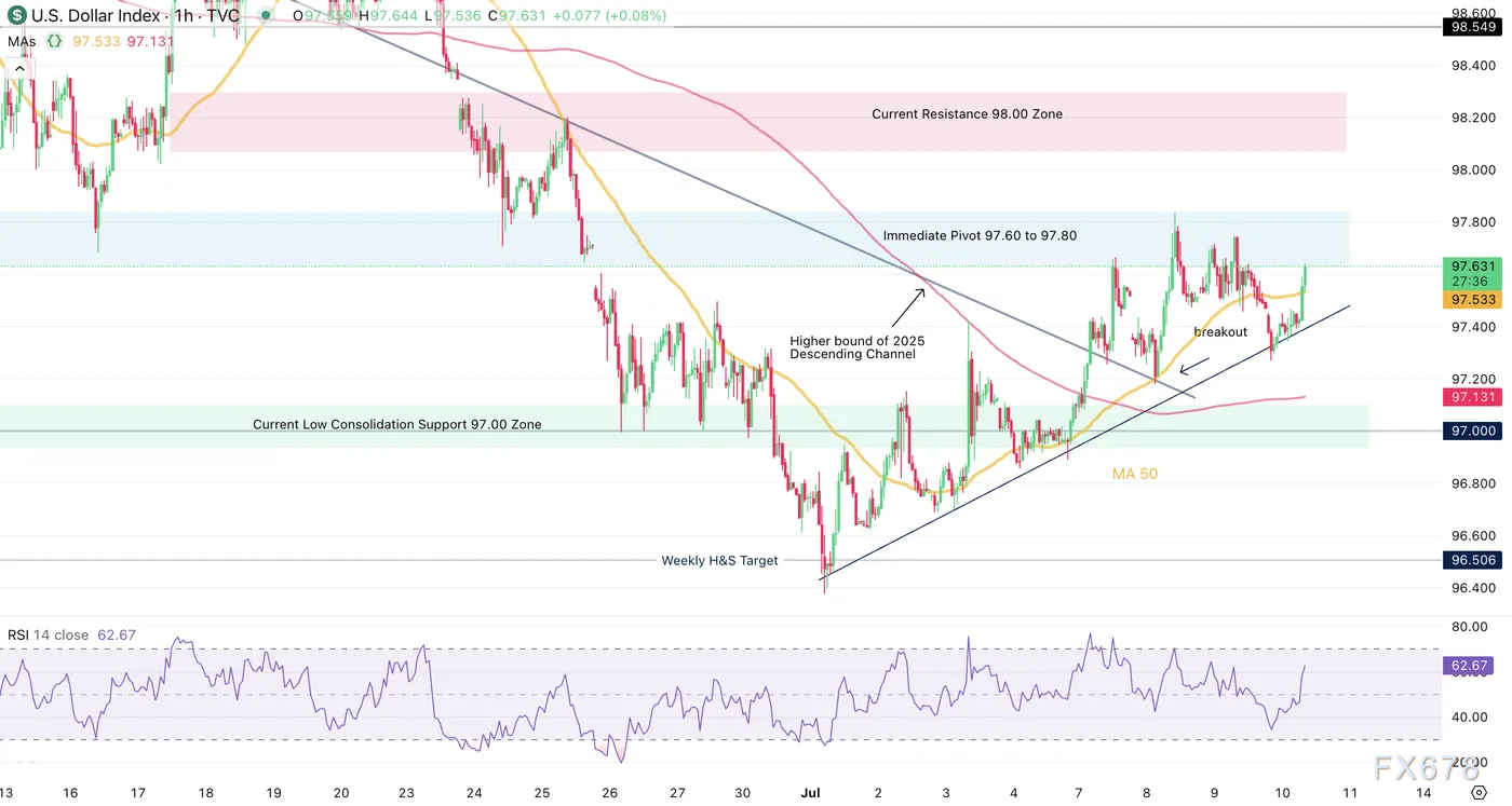 短期动能强劲,刚刚突破1小时图上的50日均线,但市场接下来要么向上突破,要么向下突破,因为过去几日的上下波动可能只是在45点区间(97.25-97.70)内的简单盘整。