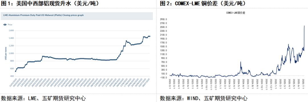 从关税引起的地区间价差看,本次特朗普宣布50%进口关税前,市场并没有预期美国将对铜征收如此高的关税,衡量美国与世界铜价差异的指标COMEX-LME铜价差多数时间处于700-1500美元/吨之间波动,暗示市场预期美国铜关税在10-20%之间。50%进口关税的消息公布后,COMEX铜大幅上涨而LME铜下跌,两地铜价差明显扩大,7月9日收盘时COMEX-LME铜价差约2560美元/吨,折合LME铜价约26.5%,距离50%仍有差距。参考美国征收铝关税前后的价差变化,今年2月10日,特朗普宣布对铝征收25%关税,3月12日生效,宣布关税后美国中西部铝升水开始走强,并比较快地计价25%关税的影响,5月30日特朗普宣布提高铝关税到50%后,美国中西部铝升水再次升高,且关税正式生效的6月4日,美国铝升水仅计价约37%的关税,直到6月12日,升水涨到计价约50%的关税。因此,当前虽然COMEX-LME价差未完全计价关税,但随着关税落地,预计两地市场价差大概率进一步扩大(预计以COMEX铜上涨和LME铜下跌共同完成价差扩大),以计价50%关税的影响。不过,考虑到美国从3月开始就提前进口大量的铜,因此预计最终价差比例或低于50%。