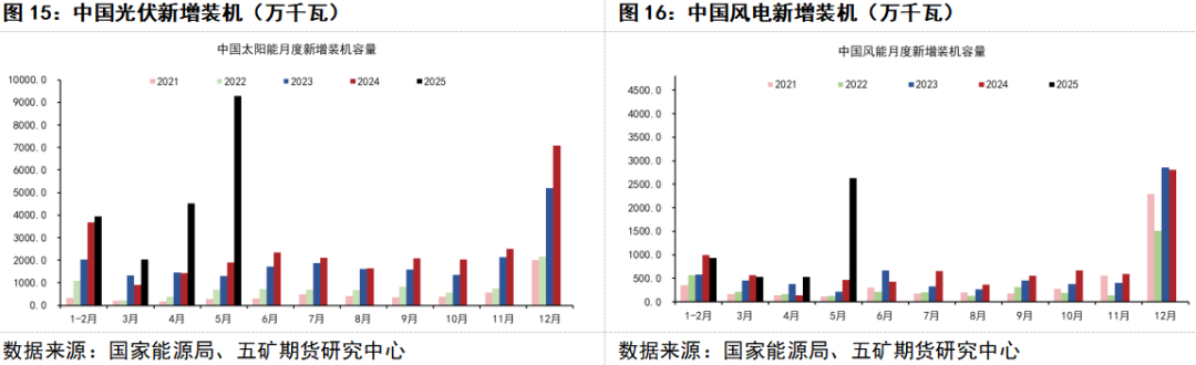 精炼铜方面,6月国内粗铜供应偏稳,国内铜冶炼检修环比增多,精炼铜产量环比小幅下滑,同比维持10%以上的较高增速。7-8月国内铜冶炼厂检修减少,预计精炼铜产量环比回升,绝对量维持高位。海外铜冶炼既有检修又有新建产能投放,但新建产能还未明显释放产量,短期产量预计维持偏低。需求方面,6月在去年低基数情况下国内表观消费延续较快增长,当月表观消费预估135.7万吨,同比增长约13.5%,1-6月累计表观消费量约798.3万吨,同比增12.0%。从铜材开工率看,6月开工率预计环比下滑,7月下游处于相对淡季,开工情况预计延续偏弱,同时,下游电力板块在新政策节点前,光伏和风力发电新增装机显著增长,5月光伏新增装机较去年同期增加逾70GW,风力发电新增装机较去年同期增加逾20GW。往后看,随着抢装节点过去,清洁能源相关需求预计边际走弱,相对用铜需求面临压力。