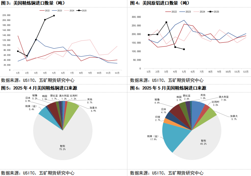 随着50%的铜关税将于8月1日生效,预计8月1日前能够实现到港的铜还将继续流向美国,美国对全球精炼铜的虹吸效应将继续,不过考虑到当前距离关税生效时间比较短,预计美洲地区(智利、秘鲁、墨西哥、加拿大等)铜流向美国的概率更大,欧洲、亚洲地区铜到美国运输时间较长,预计流向美国的量将减少,LME市场铜的供应紧张局面有望缓解。更长时间看,随着美国对铜征收关税生效,8月以后美国进口铜需求预计明显减少(参考铝,3月美国原铝进口达到顶峰,3月后进口量回落到正常水平以下),美国以外市场的铜供应预计将更加充足。