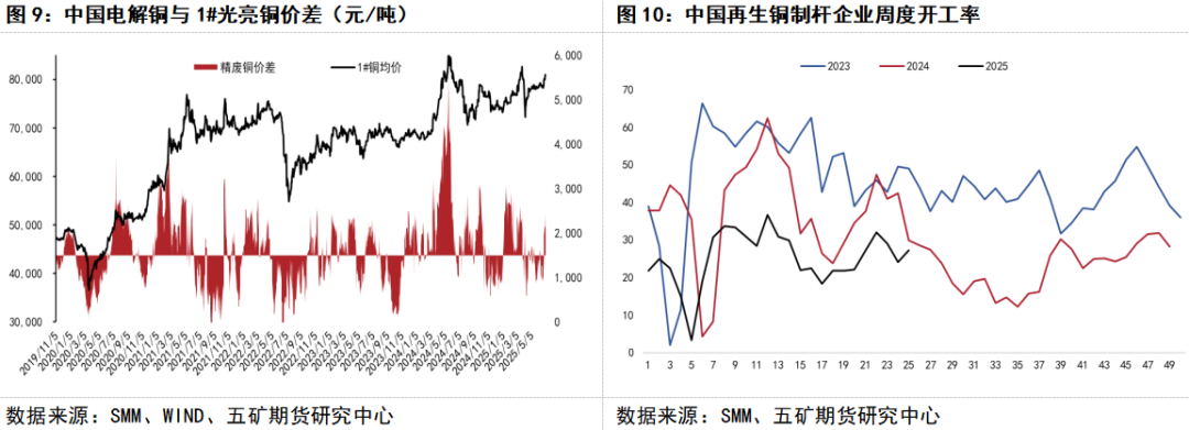 废铜方面,6月以来国内精废铜价差有所扩大,当月均值约1350元/吨,环比小幅走扩,废铜替代优势有所提升。当期再生铜制杆企业开工率震荡反弹,对精炼铜的替代有所增多。7月初尽管铜价上涨,但国内废铜供应相对偏紧,从消费端对电解铜形成的替代增量相对有限,短期内废铜对铜价支撑较强。不过美国对铜征收关税落地后,若中国铜进口如期增加,则废铜的支撑作用或将减弱。