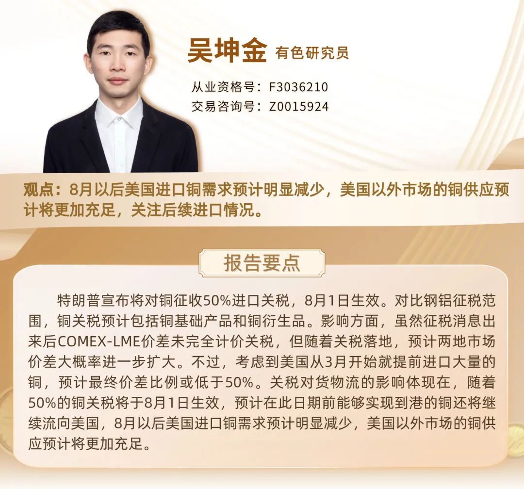 特朗普宣布将对铜征收50%进口关税,8月1日生效。对比钢铝征税范围,铜关税预计包括铜基础产品和铜衍生品。影响方面,虽然征税消息出来后COMEX-LME价差未完全计价关税,但随着关税落地,预计两地市场价差大概率进一步扩大(预计以COMEX铜上涨和LME铜下跌共同完成价差扩大)。不过,考虑到美国从3月开始就提前进口大量的铜,预计最终价差比例或低于50%。关税对货物流的影响体现在,随着50%的铜关税将于8月1日生效,预计在此日期前能够实现到港的铜还将继续流向美国,8月以后美国进口铜需求预计明显减少,美国以外市场的铜供应预计将更加充足。