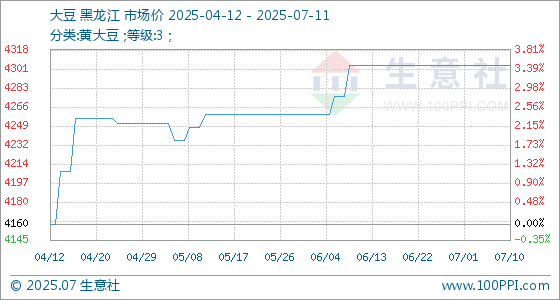 7月11日,生意社大豆基准价为4304.00元/吨,与本月初持平。